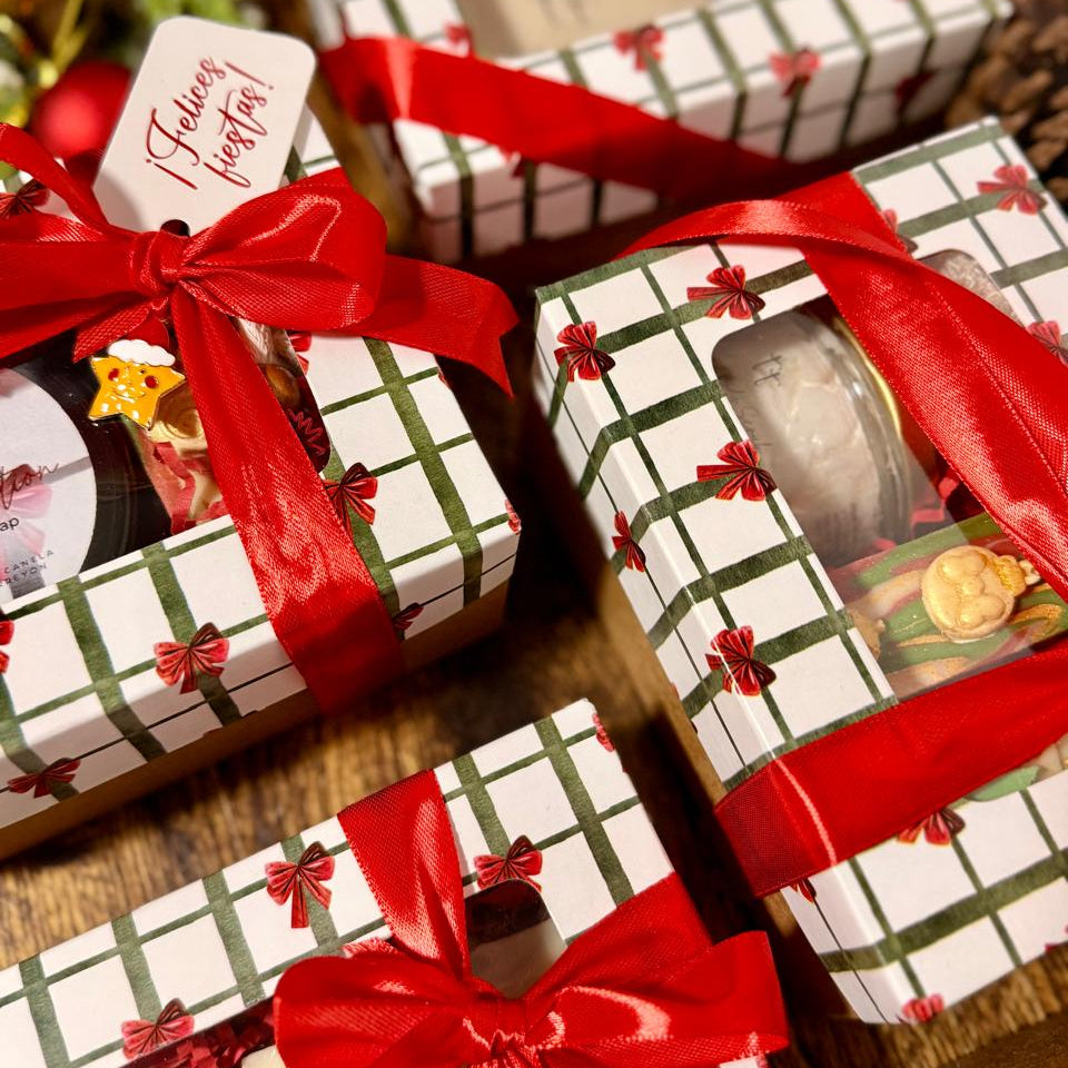 Todo viene presentado en una caja navideña con ventana, relleno decorativo rojo y lazo satinado. Un regalo práctico, elegante y lleno de cariño.