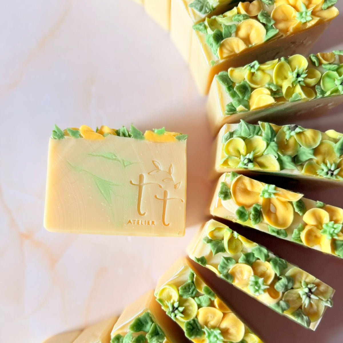 Un jabón artesanal elaborado con manteca de karité, arcilla blanca, cera de abejas y aceites vegetales que hidratan, nutren y regeneran la piel, mientras su diseño floral ilumina tu ducha con color y delicadeza.