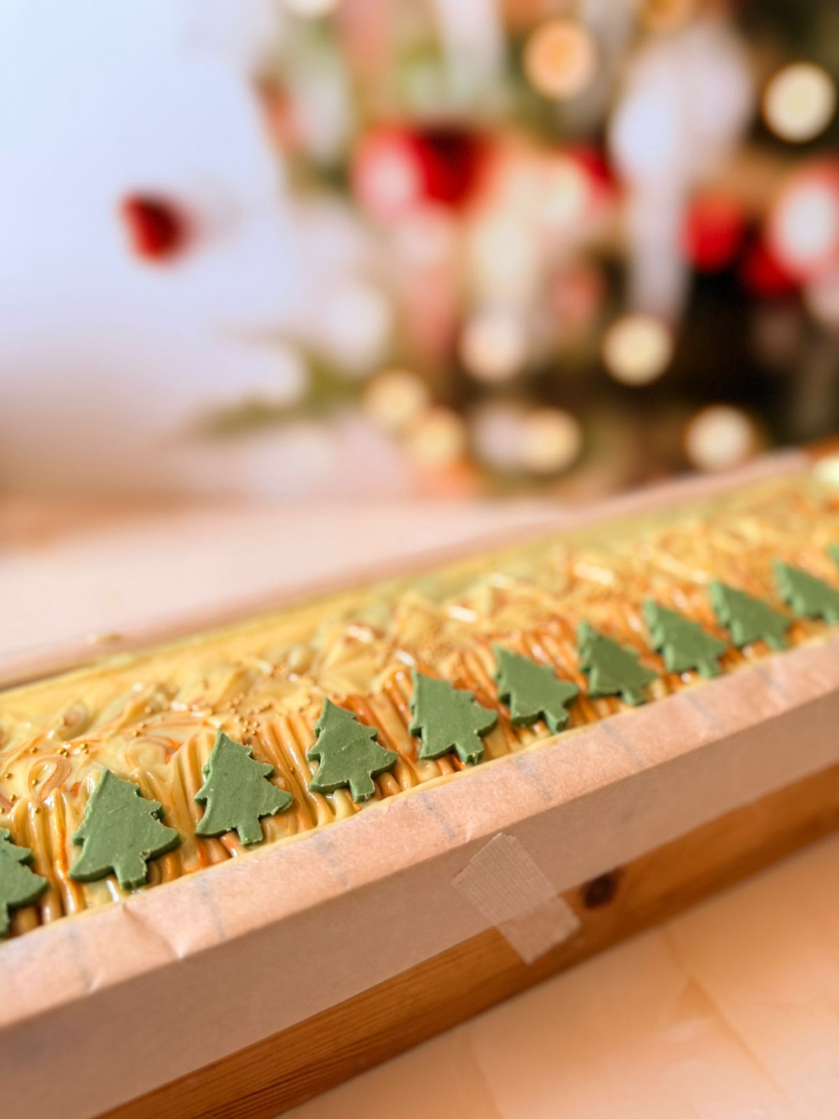 El diseño —crema dorado con remolinos suaves y un pino verde en el tope— evoca un paisaje navideño elegante y minimalista, ideal para quienes aman aromas limpios y naturales.